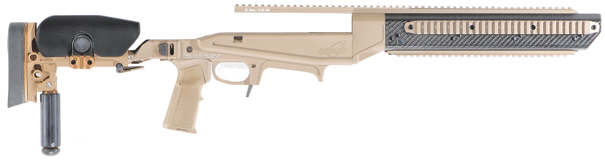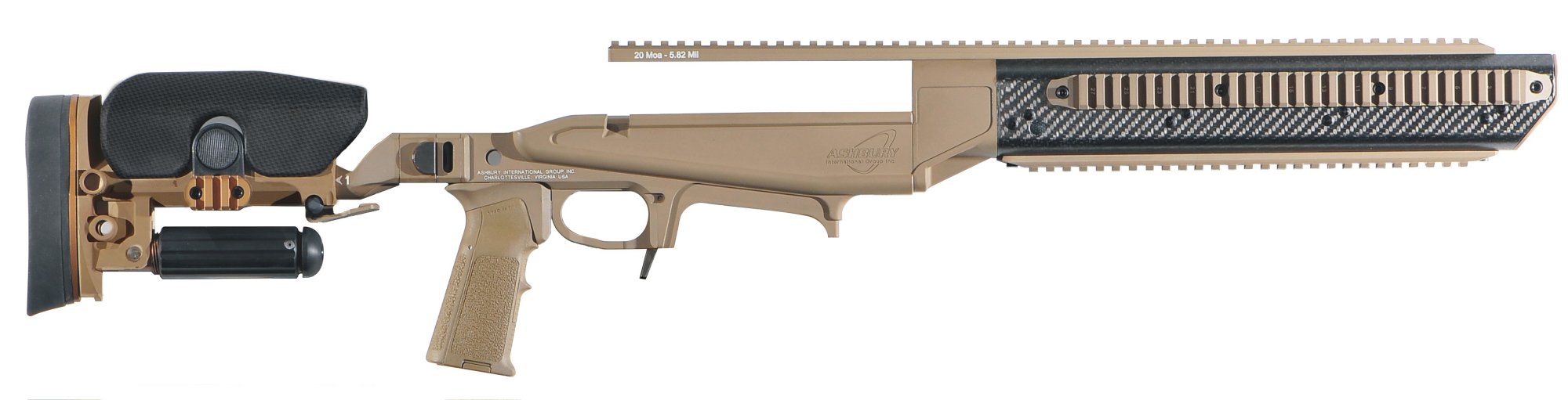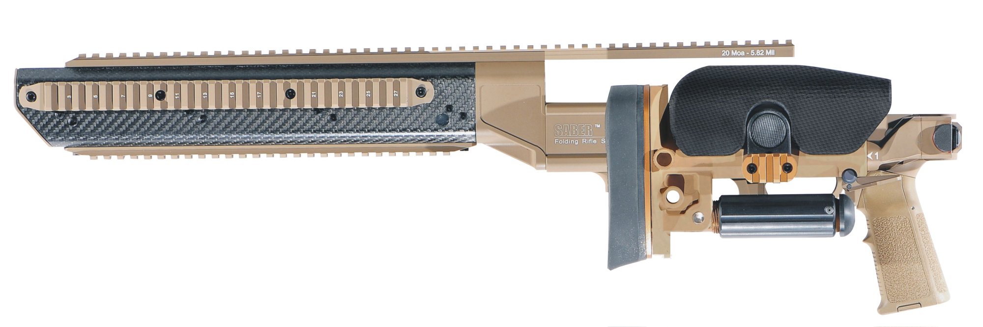 decent photos of the Gen 2 AIG Asymmetric Warrior ASW338LM Modular Precision Sniper Rifle (MPSR) and AIG SABER-FORRST modular chassis/stock system for your perusal. Just click on them to view them full-size. As you can see in the accompanying photos, the ASW338LM MPSR’s modular chassis utilizes a healthy combination of aluminum and carbon fiber to minimize weight and maximize strength as much as possible to enhance mobility and tactical/operational utility. The rifle also incorporates a left-side-folding buttstock in order to further enhance mobility and maximize storage capability.
